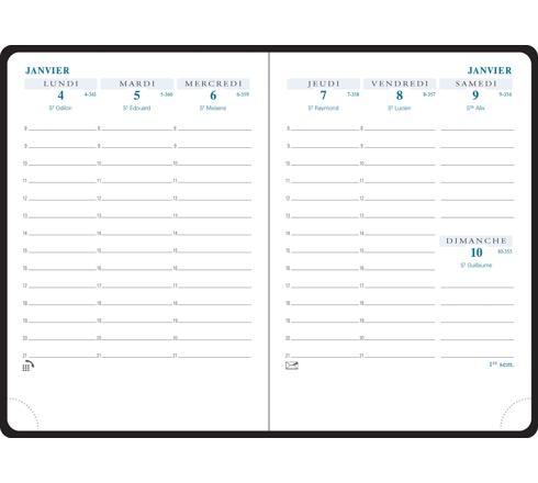 Les + : impression en bleu et gris sur papier blanc Clairefontaine, reconnu pour sa qualité et pour permettre une écriture douce et fluide - coins détachables, pour pouvoir accéder rapidement au jour en cours - indication du numéro de semaine pour se repérer plus facilement - chaque jour, mention des Saints pour ne pas oublier les fêtes à souhaiter.