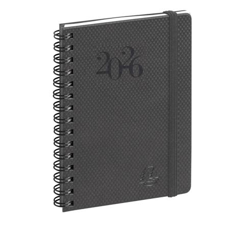 Couverture en synthétique, grain textile, spirale métal extérieure. Fermeture avec un élastique assorti. Marquage du millésime à chaud. Les + : - impression en bordeaux et gris, sur papier ivoire Clairefontaine, reconnu pour sa qualité et pour permettre une écriture douce et fluide, - tranche naturelle, - coins détachables, pour pouvoir accéder rapidement à la semaine en cours.