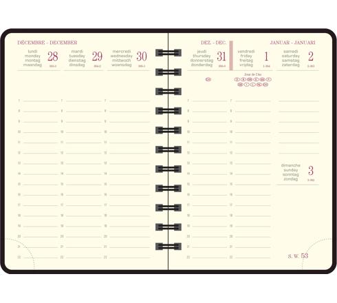 L'agenda en version souple. La semaine sur 2 pages, grille verticale, large amplitude horaire de 7h à 22h, édition multilingue.