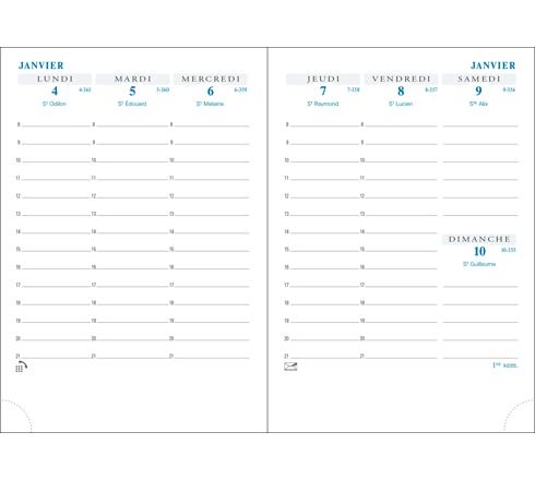 Les + : - impression en bleu et gris, sur papier blanc Clairefontaine, reconnu pour sa qualité et pour permettre une écriture douce et fluide, - tranche naturelle, - coins détachables, pour pouvoir accéder rapidement à la semaine en cours.