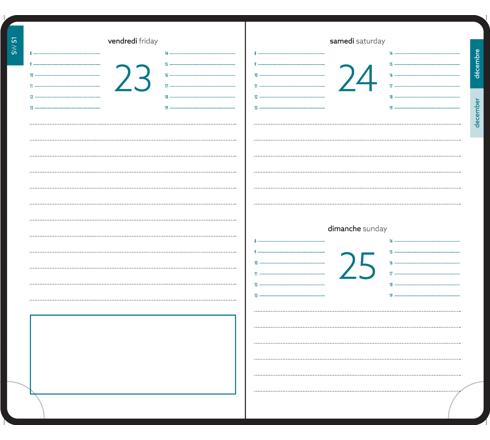Les + : impression en bleu vert, sur papier blanc Clairefontaine, reconnu pour sa qualité et pour permettre une écriture douce et fluide, - coins détachables, pour pouvoir accéder rapidement à la semaine en cours. Planning par trimestre de l'année en cours et de la prochaine.