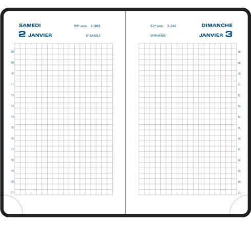 L'agenda en version souple. La journée sur 1 page, impression quadrillée, large amplitude horaire de 8h à 21h, édition française.