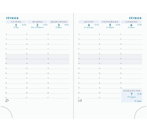 Reliure brochée cousue pour une plus grande solidité. Les + : - impression en bleu et gris, sur papier blanc Clairefontaine, reconnu pour sa qualité et pour permettre une écriture douce et fluide, - tranche dorée, - coins détachables, pour pouvoir accéder rapidement à la semaine en cours.