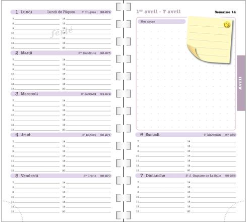 Les + : intérieur coloré, des coloris différents chaque trimestre, pour une année lumineuse et organisée. Agenda imprimé sur papier blanc Clairefontaine, reconnu pour sa qualité et pour permettre une écriture douce et fluide - coins détachables, pour pouvoir accéder rapidement au jour en cours - indication du numéro de semaine pour se repérer plus facilement - chaque jour, mention des Saints pour ne pas oublier les fêtes à souhaiter.