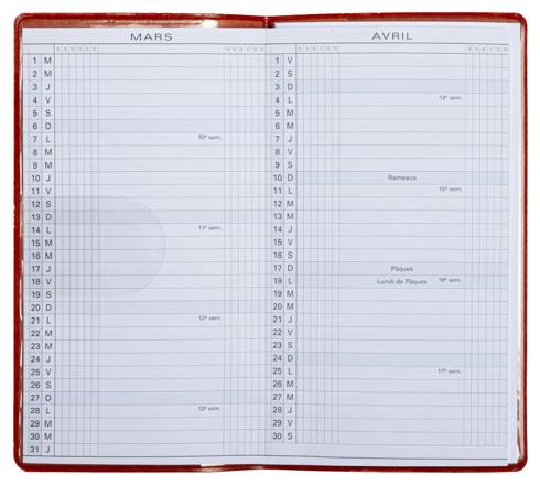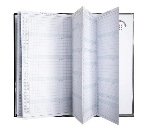 Sur chaque page de mois, il est possible de cocher des cases horaires indiquées de 8h à 19h, et de mentionner un objet sur la ligne correspondante au jour. Au dos du dépliant, il y a des indications sur : les vacances scolaires par zone, les calendriers de l'année en cours et de l'année suivante et 9 pages de notes.