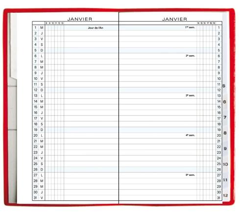 La recharge de votre agenda est fabriquée en France dans une démarche d'amélioration continue, avec un papier issu de forêts contrôlées. L'agenda planning mensuel extra-plat. Pour un usage confortable, chaque mois est présenté sur une double page, avec une découpe indexée sur la droite pour repérer facilement le mois recherché. Impression sur papier blanc.