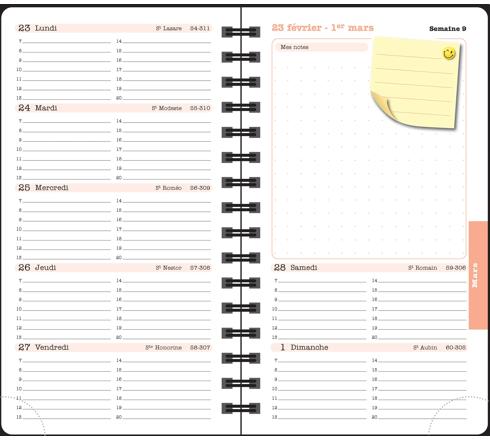 Cet agenda ne pourra que vous séduire : la possibilité de noter des rendez-vous sur les 7 jours de la semaine (rdv par heure, de 7h à 20h) avec une grille du temps à l'horizontale, une grande place pour noter et se rappeler. L'atout supplémentaire : au début de chaque mois, un calendrier mensuel sur 2 pages pour visualiser le mois à venir (sous forme de cases) et s'organiser au mieux. La spirale facilite l'ouverture et la mise à plat de l'agenda. Les + : - impression en couleur sur papier blanc Clairefontaine, reconnu pour sa qualité et pour permettre une écriture douce et fluide, - emplacement mémo, - grande place pour les notes, - pochette transparente, - coins détachables, pour pouvoir accéder rapidement à la semaine en cours.