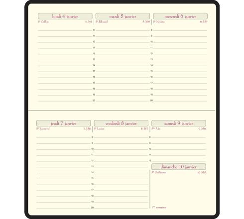 Couverture amovible en plastique grainé. Reliure brochée pour une meilleure solidité. Les + : - larges colonnes pour noter les rdv, - impression en bordeaux et gris sur papier ivoire Clairefontaine, reconnu pour sa qualité et pour permettre une écriture douce et fluide, - tranche dorée, - coins détachables, pour pouvoir accéder rapidement à la semaine en cours, - spirale intérieure.