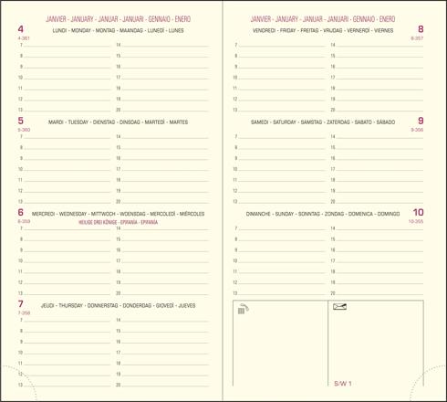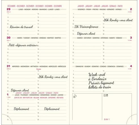 La recharge de votre agenda est fabriquée en France dans une démarche d'amélioration continue, avec un papier issu de forêts contrôlées. La semaine sur 2 pages à l'horizontal, 7 jours complets, large amplitude horaire avec RDV de 7h à 20h, édition multilingue.