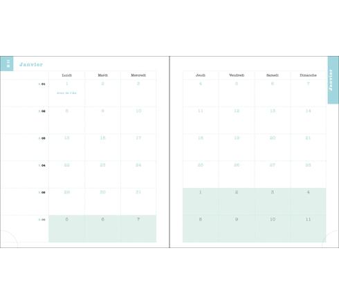 L'atout supplémentaire : au début de chaque mois, un calendrier mensuel sur 2 pages pour visualiser le mois à venir (sous forme de cases) et s'organiser au mieux. Les + : - impression en couleur sur papier blanc Clairefontaine, reconnu pour sa qualité et pour permettre une écriture douce et fluide, - emplacement mémo, - grande place pour les notes, - coins détachables, pour pouvoir accéder rapidement à la semaine en cours. Couverture amovible au toucher doux.
