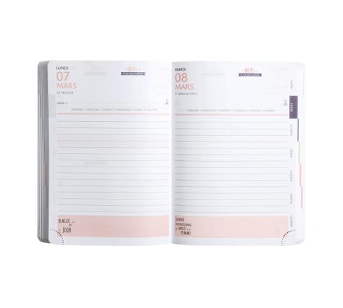 Une touche colorée avec une matière textile pour se sentir en été toute l'année ! Agenda 1 jour par page la semaine et 2 jours par page pour le week-end.