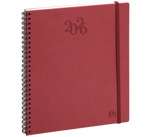 Couverture en synthétique, grain textile, spirale métal. Fermeture avec un élastique assorti. Les + : - impression en bordeaux et gris, sur papier ivoire Clairefontaine, reconnu pour sa qualité et pour permettre une écriture douce et fluide, - tranche naturelle, - coins détachables, pour pouvoir accéder rapidement à la semaine en cours. La finition spiralée facilite l'ouverture et la mise à plat de l'agenda.