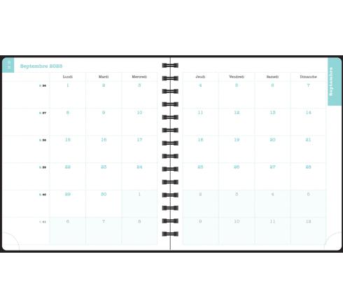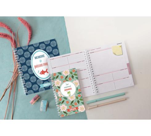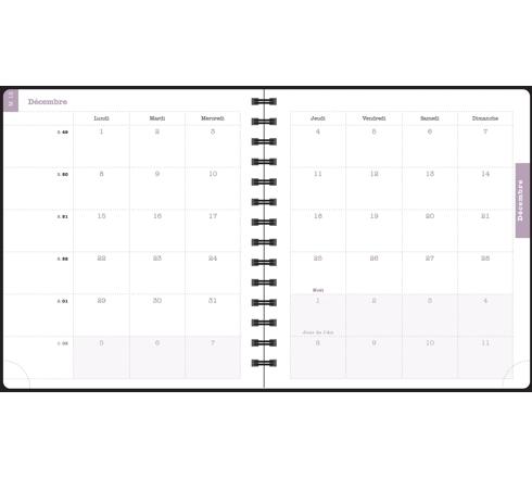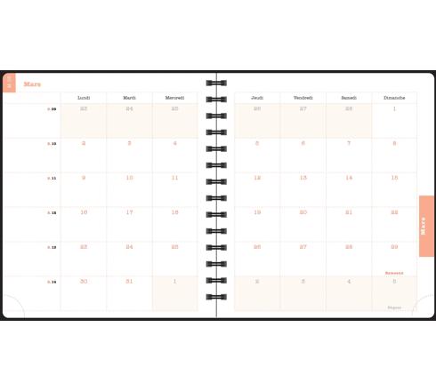 Cet agenda ne pourra que vous séduire : la possibilité de noter des rendez-vous sur les 7 jours de la semaine (rdv par heure, de 8h à 20h) avec une grille du temps à l'horizontale, une grande place pour noter et se rappeler. L'atout supplémentaire : au début de chaque mois, un calendrier mensuel sur 2 pages pour visualiser le mois à venir (sous forme de cases) et s'organiser au mieux. La spirale facilite l'ouverture et la mise à plat de l'agenda. Les + : - impression en couleur sur papier blanc Clairefontaine, reconnu pour sa qualité et pour permettre une écriture douce et fluide, - emplacement mémo, - grande place pour les notes, - coins détachables pour pouvoir accéder rapidement à la semaine en cours, - pochette transparente.