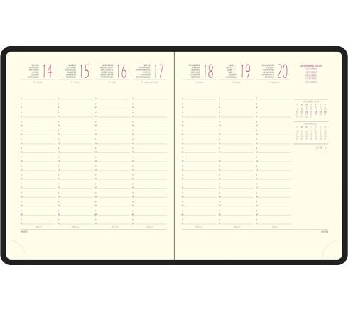 Les + : - impression en bordeaux et gris sur papier ivoire Clairefontaine, reconnu pour sa qualité et pour permettre une écriture douce et fluide, - tranche naturelle, - coins détachables, pour pouvoir accéder rapidement à la semaine en cours.