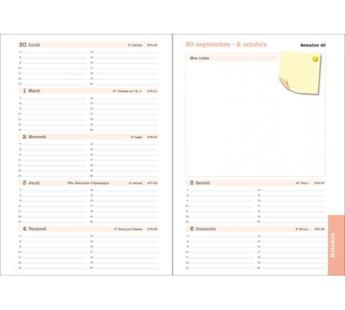 L'atout supplémentaire : au début de chaque mois, un calendrier mensuel sur 2 pages pour visualiser le mois à venir (sous forme de cases) et s'organiser au mieux. Les + : - impression en couleur sur papier blanc Clairefontaine, reconnu pour sa qualité et pour permettre une écriture douce et fluide, - emplacement mémo, - grande place pour les notes, - coins détachables, pour pouvoir accéder rapidement à la semaine en cours. Couverture amovible au toucher doux.