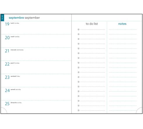Les + : impression en bleu et vert sur papier blanc Clairefontaine, reconnu pour sa qualité et pour permettre une écriture douce et fluide - coins détachables, pour pouvoir accéder rapidement au jour en cours. Reliure spiralée pour une ouverture à plat facile.