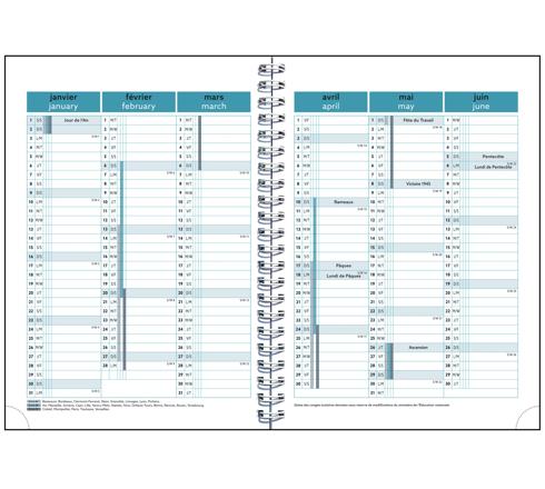 Les + : impression en coloris bleu vert sur papier blanc Clairefontaine, reconnu pour sa qualité et pour permettre une écriture douce et fluide, en début et fin d'agenda des pages de plannings annuels, des pages de notes en fin d'agenda, des coins détachables en bas de chaque page pour pouvoir accéder rapidement à la semaine en cours.
