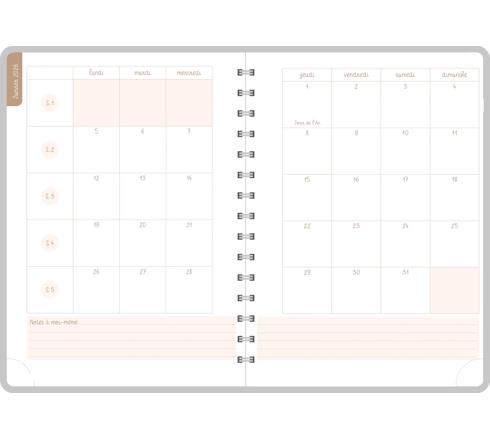 Pages spécifiques : une page de stickers fantaisie en début d'agenda, un récapitulatif des objectifs à la fin de chaque mois, les calendriers semestriels de l'année en cours et de l'année suivante. Couverture imprimée sur une carte souple, effet mat. Imprimé sur papier blanc, finition spiralée, coins détachables pour retrouver la semaine rapidement.