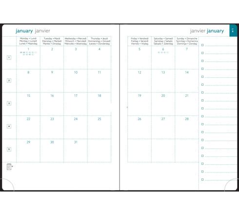 L'agenda-calendrier comporte au début un planning de l'année sur 4 pages, avec l'indication des jours fériés français et internationnaux. Et en fin d'agenda, vous trouverez le planning de l'année suivante sur 2 pages.