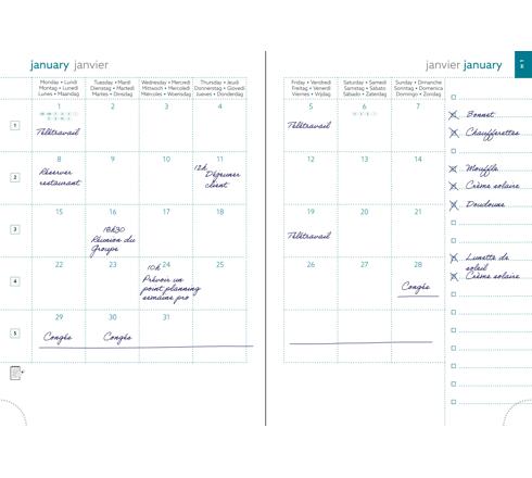L'agenda-calendrier ultra fin ! Il vous propose une lecture rapide de votre organisation mensuelle, sous forme de cases. Et vous pouvez ensuite prendre des notes sur la double page suivante. Edition multilingue : anglais, français, allemand, espagnol, italien, née rlandais. 64 pages.