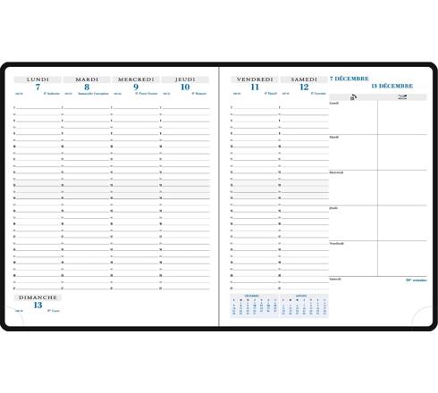 Les + : impression en bleu et gris, sur papier blanc Clairefontaine, reconnu pour sa qualité et pour permettre une écriture douce et fluide, tranche naturelle, emplacements rappels ou mémos, coins détachables, pour pouvoir accéder rapidement à la semaine en cours.