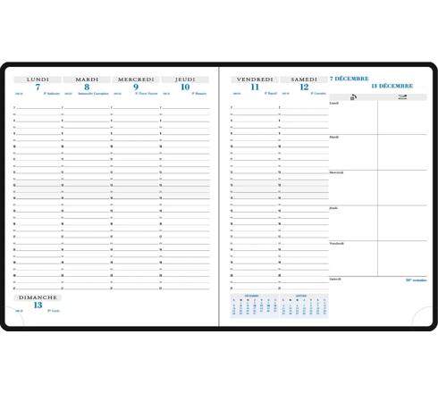 Les + : impression en bleu et gris, sur papier blanc Clairefontaine, reconnu pour sa qualité et pour permettre une écriture douce et fluide, tranche naturelle, emplacements rappels ou mémos, coins détachables, pour pouvoir accéder rapidement à la semaine en cours.