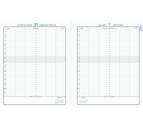 Un bel agenda façon cuir lisse aux finitions soignées. Un jour par page, rendez-vous par 1/4 d'heure de 7h à 21h45, planning de 3/6 utilisateurs. Couverture amovible synthétique aspect cuir lisse. Reliure brochée cousue pour une plus grande solidité.