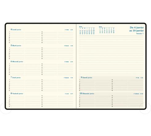 L'agenda qui permet de gérer la semaine complète et qui laisse une grande place aux notes. La semaine sur 2 pages, grille verticale, horaires de 7h à 20h, édition française.