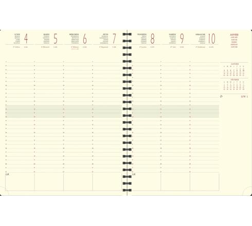 Couverture amovible en synthétique, avec une finition haut de gamme (piqûre sellier). Spirale intérieure, pour une ouverture et une mise à plat facile de l'agenda. Les + : impression en bordeaux et gris, sur papier ivoire Clairefontaine, reconnu pour sa qualité et pour permettre une écriture douce et fluide, tranche naturelle, coins détachables, pour pouvoir accéder rapidement à la semaine en cours, emplacements pour les rappels.