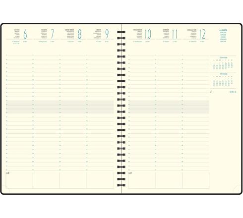 Une version souple de l'agenda décliné dans une matière douce façon textile. La semaine sur 2 pages à la verticale, 7 jours complets, large amplitude horaire avec RDV par 1/2h de 7h à 21h, édition multilingue. Couverture en synthétique, grain textile, spirale métal extérieure. Fermeture avec un élastique assorti. Marquage du millésime à chaud.
