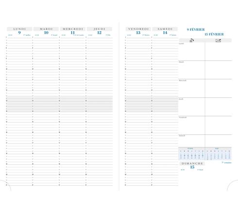 L'agenda professionnel avec la semaine sur 2 pages, grille verticale, large amplitude horaire avec rdv par 1/4h de 7h à 21h, 6 jours complets (emplacement pour le dimanche sans horaire), édition française.
