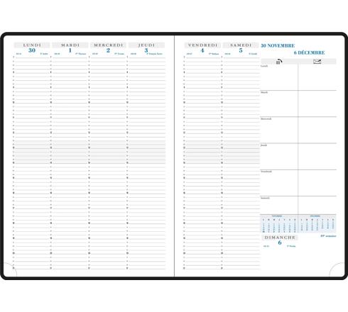 L'agenda professionnel. La semaine sur 2 pages, grille verticale, large amplitude horaire avec rdv par 1/4h de 7h à 21h, 6 jours complets, édition française. Couverture amovible au toucher cuir lisse avec finition haut de gamme (piqûre sellier). Reliure brochée cousue pour une plus grande solidité.