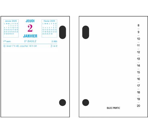 Page de gauche avec la date et les calendriers des mois en cours et suivant. Page de droite pour noter les rendez-vous de 8h à 20h.
