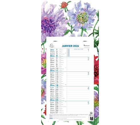 CALENDRIER MENSUEL FLEURS AVEC FEUILLETS DÉTACHABLES 15,5 X 28,5 CM SUR SUPPORT PLAQUE IMPRIMÉE 19 X 41 CM 2026 - VISUELS ASSORTIS