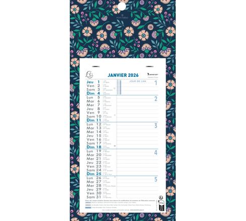 Un calendrier avec les décors fleuris de Mini Labo. 12 feuillets mensuels détachables, avec l'indication des vacances scolaires, les dimanches et les jours fériés sont imprimés en bleu pour les repérer facilement, de la place pour écrire sur chaque jour.