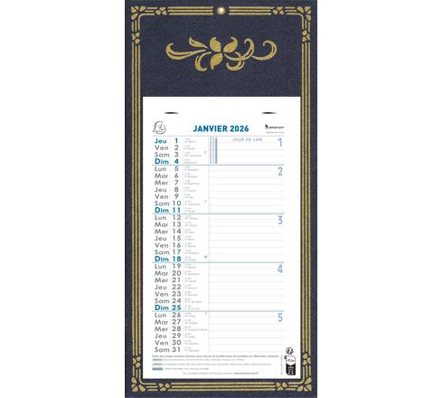 12 feuillets mensuels détachables, avec l'indication des vacances scolaires, les dimanches et les jours fériés sont imprimés en bleu pour les repérer facilement, de la place pour écrire sur chaque jour.