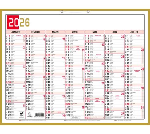 CALENDRIER TRICOLORE NEUTRE 43 X 33,5 CM SEMESTRIEL 2026 - ROUGE, NOIR ET OR