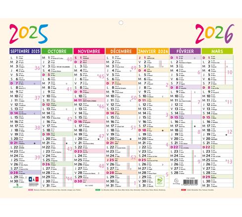 Numéro de la semaine pour se repérer plus facilement. Les dimanches et les jours fériés sont en couleurs.