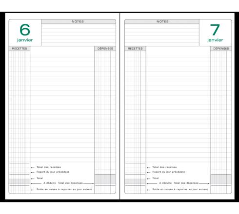 Un agenda destiné aux professionnels pour noter chaque jour le détail des recettes et des dépenses. Particularité de cet agenda : il est perpétuel, sans indication de l'année. Avec un jour par page, tous les jours de l'année. Il laisse toute la liberté de noter ce que l'on veut, sans contrainte horaire. Avec en haut de chaque page un emplacement pour les notes.