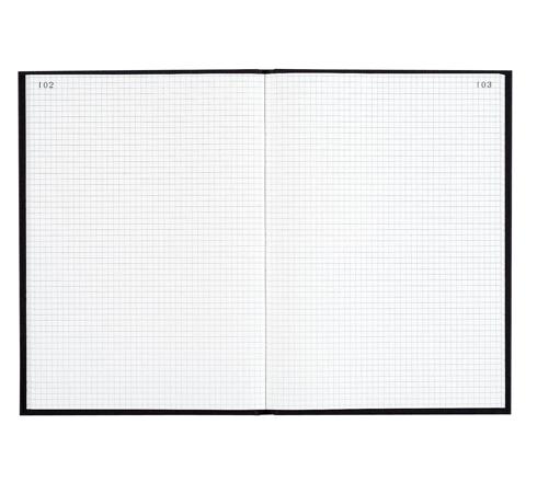 Dimensions 34 x 22,5 cm - 500 pages numérotées - Intérieur imprimé quadrillé 5x5 - petits carreaux - couverture rigide recouverte d'une toile noire