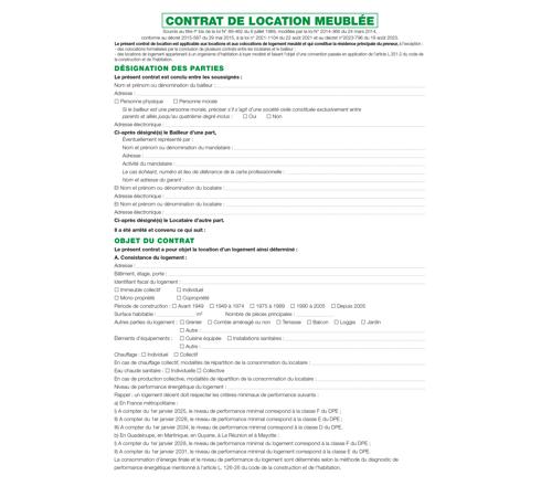 Contient 6 feuilles Contrat de location meublée, 4 liasses État des lieux autocopiantes en 3 exemplaires, 3 imprimés Notice d'information relative aux droits et obligations des locataires et des bailleurs, 2 feuilles Inventaire et état du mobilier, 2 liasses Acte de caution autocopiantes en 2 exemplaires.