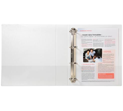 Couverture rigide. 3 pochettes extérieures pour personnaliser la 1ère de couverture, le dos et la 4ème de couverture. 2 pochettes intérieures permettant le maintien des feuilles. Anneaux en D pour un alignement parfait des feuilles et des intercalaires. Qualité supérieure pour une utilisation intensive.