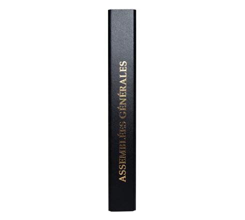 La reliure Exacompta est composée d'un classeur rembordé plastique, 4 anneaux en D en 3ème de couverture (ouverture simultanée des 4 anneaux), titre imprimé en doré sur la couverture et au dos du classeur, ainsi que de 100 feuillets foliotés de 1 à 100 avec page de garde personnalisable Assemblées générales.