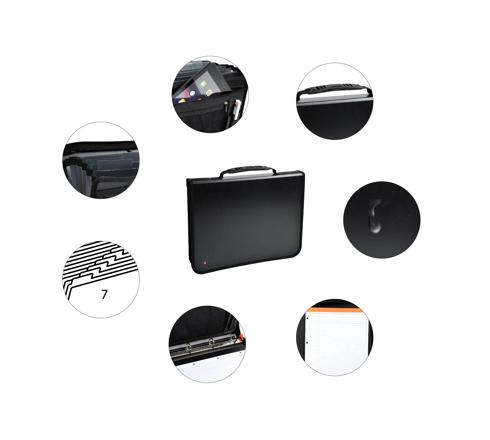 L'Exafolder est un conférencier valisette avec poignée et fermeture zippée. Equipé d'une partie trieur, de pochettes zippées, d'un c ompartiment renforcé pour tablette et de porte-stylos, il est multi-usages et permet de prendre des notes, de classer des documents perforés dans le classeur ou des dossiers dans la partie trieur, tout en rangeant quelques affaires personnelles comme des stylos, téléphone, tablette, ...