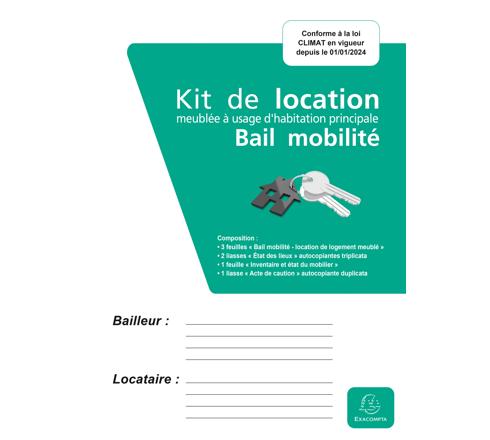 Contient 3 feuilles Bail mobilité (1 feuille pour le locataire, 1 pour le bailleur et 1 pour la caution), 2 liasses État des lieux autocopiantes en 3 exemplaires (1 liasse pour l'état des lieux d'entrée, 1 liasse pour l'état des lieux de sortie), 1 feuille Inventaire et état du mobilier, 1 liasse Acte de caution autocopiante en 2 exemplaires.