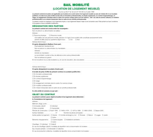 Contient 3 feuilles Bail mobilité (1 feuille pour le locataire, 1 pour le bailleur et 1 pour la caution), 2 liasses État des lieux autocopiantes en 3 exemplaires (1 liasse pour l'état des lieux d'entrée, 1 liasse pour l'état des lieux de sortie), 1 feuille Inventaire et état du mobilier, 1 liasse Acte de caution autocopiante en 2 exemplaires.