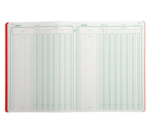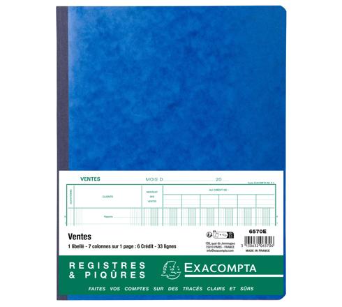 La piqûre Ventes permet de relever par client les ventes classées par catégorie sur 6 colonnes + une colonne de sous-total, en 33 lignes avec total et report du total de la double page précédente. Chaque double page est numérotée pour éviter les ruptures et les falsifications. Il est possible d'indiquer le mois et l'année concernés en en-tête.