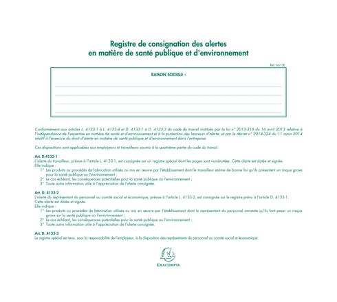 Permet la consignation des alertes déclenchées par les salariés ou le représentant du personnel au C.S.E. en cas de risque sanitaire ou environnemental (date de l'alerte, nom du lanceur d'alerte, produits ou procédés visés, conséquences potentielles sur la santé et l'environnement, ...).
