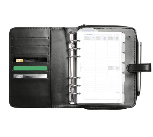 La semaine sur 2 pages à la verticale - amplitude horaire du lundi au vendredi 8h à 20h, samedi 8h à 13h et espace de notes pour le dimanche. Papier blanc impression en bleu et gris. 4 fentes pour cartes de crédit dont 1 emplacement carte avec fenêtre transparente. 1 poche pour glisser des papiers. 1 fente pour bloc note en 3e de couverture.