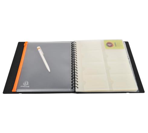 Livré avec 20 pochettes pour cartes de visite, intercalaires à touches alphabétiques et pochette zippée perforée pour ranger et protéger de petits objets ou quelques cartes supplémentaires. Les pochettes et intercalaires sont détachables et repositionnables.